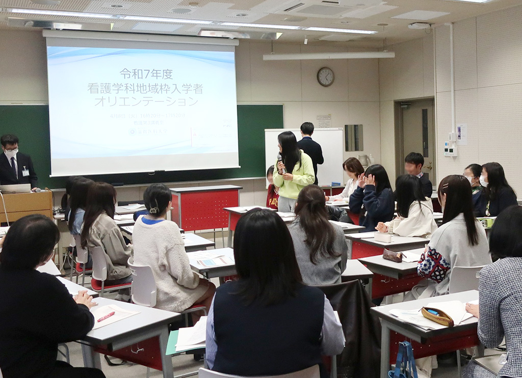看護地域枠の新年度入学生を対象に、担当教職員と滋賀県医療政策課職員から、看護地域枠制度の趣旨とキャリア形成支援について説明を行っています。