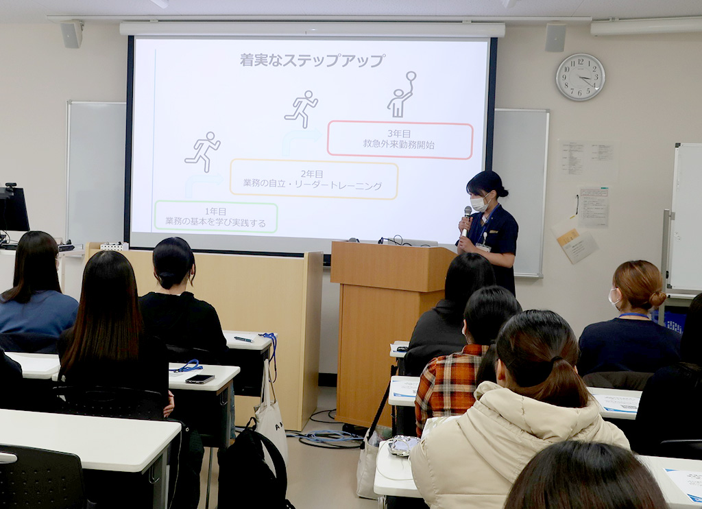 令和7年度は12月1日に、「滋賀県で活躍する若手看護職のリアルからの学びとやりがい」をテーマに滋賀県内で活躍する1~4年目の看護師・助産師・保健師の方を講師として招き、講演会とワークショップを開催しました。看護地域枠学生19名が参加しました。